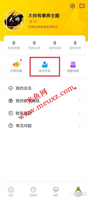 然后注册登陆,在“我的”中,点击成为作者,就可以上传你的作品并且自定义你的名称,别人通过输入你的名称就可以看广告拿到你所分享的表情包了。