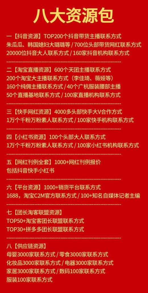 各行业人脉资源包(抖音,淘宝,快手,小红书等)